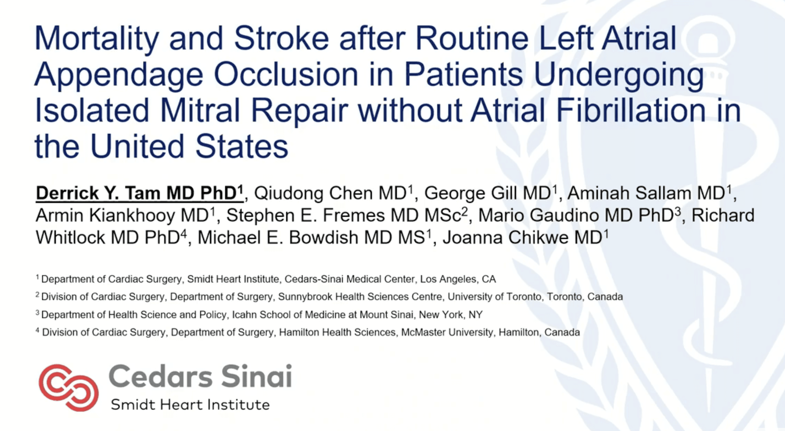 Presenting at the AATS annual meeting, Dr. Tam shares findings from over 10,000 mitral repairs: adding left atrial appendage occlusion lowered 5‑year stroke risk from 8.3% to 6.4%, with no survival impact, supporting further trials